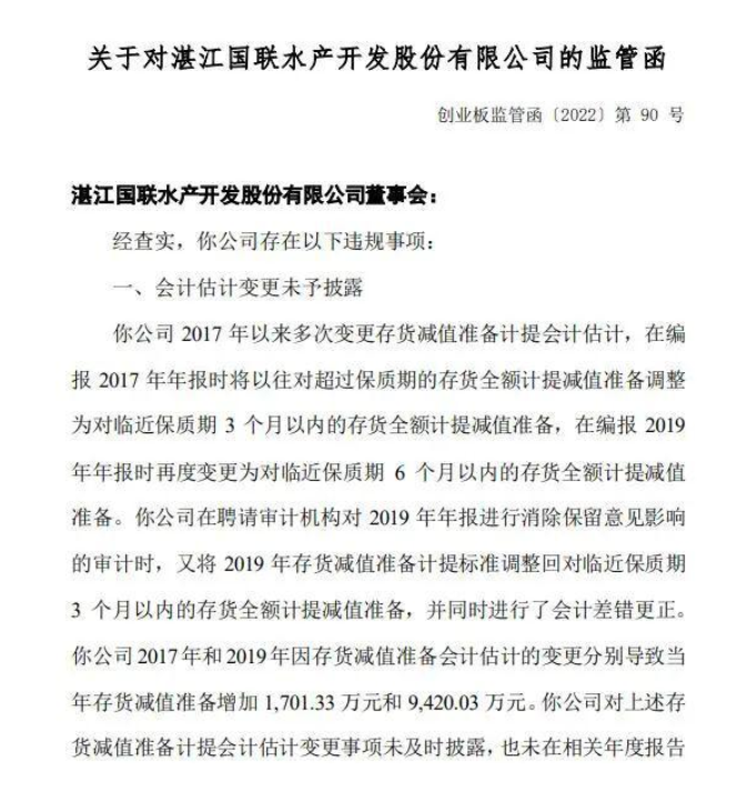 2022年5月,國聯水產在一個月內接連收到問詢函、監管函,除公司經營數據表現不佳外,信息披露不規范性問題也遭到監管層質疑。