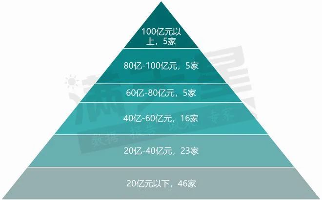 入榜企業按2022年營收規模分布來看,100億元以上的企業數量較少,為5家。