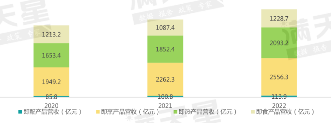 2022年中國預制菜市場結構中,即烹、即熱、即食、即配類型預制菜食品規模分別為2556.3億元、2093. 2億元 、1228.7億元和113.9億元,其中,占比最高的為即烹產品,但其營收增速水平有所回落,從2022年的16.1%下降到2022年的13% 。