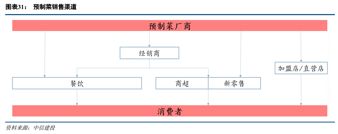 存量市場B端占據主要規模,企業基于規模優勢可以彌補封閉渠道客戶壓價、上游原材料波動的風險。增量市場方面,C端滲透率正在快速提升。繽紛中華飲食文化和龐大人口基數,將產生明顯長尾效應,高毛利與品牌力是吸引企業布局的重要動力。預制菜產業鏈環節涉及上游農業、中游生產加工、下游市場運營。本篇將現有預制菜生產企業分為三大類:上下游產業縱向延伸企業、相關產業橫向跨界企業以及專業預制菜企業。行業總體集中度仍然偏低。在發展過程中,不同環節企業的合作賦能、優勢互補在加強,同時上下游縱向整合與一體化趨勢也在加速,這需要企業具備綜合實力。