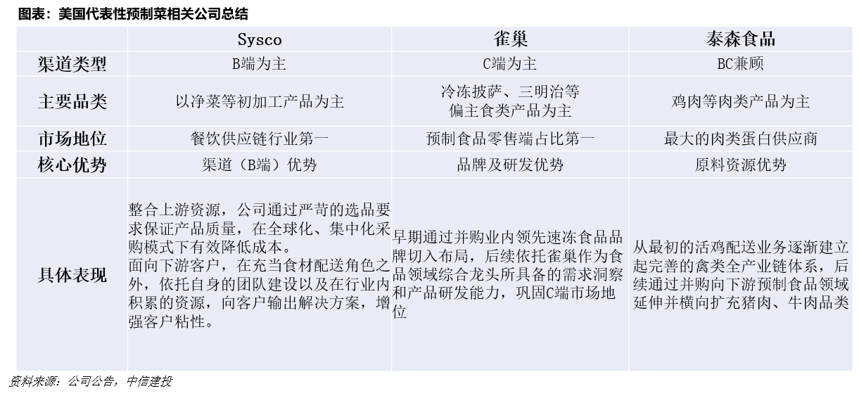 就業內代表性企業而言,Sysco作為餐飲供應鏈企業,在B端渠道的優勢明顯,通過并購完成對上下游資源的高效整合,目前主要以凈菜等初加工產品為主,并通過向客戶輸出解決方案來增強客戶粘性。與之不同,雀巢在C端市場占比靠前,發展早期便推出了預制罐頭食品,此后通過收購在冷凍披薩等市場排名第一,并依托自身作為食品綜合龍頭對消費趨勢的洞察,持續推動產品創新。此外,泰森食品基于自身禽類的全產業鏈體系,通過并購向下游預制食品領域延伸,帶動整體盈利能力提升。