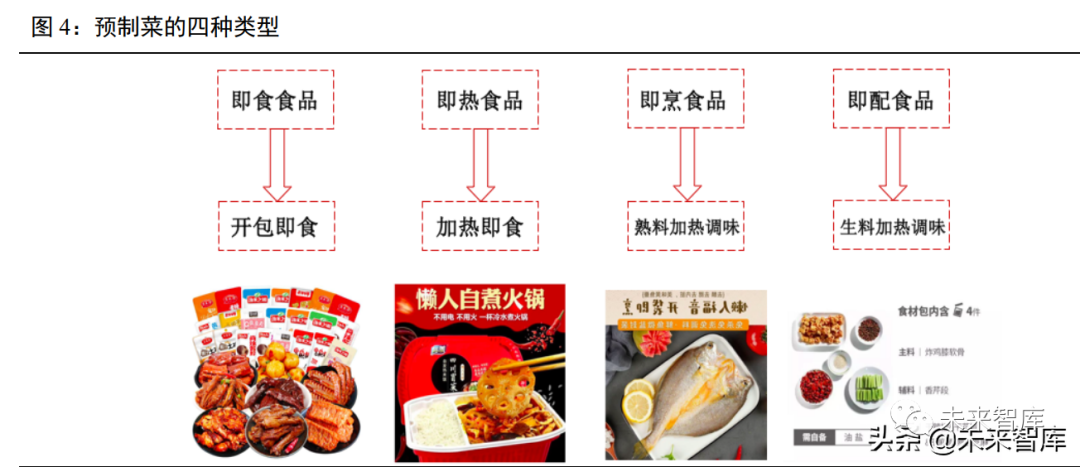 預制菜根據加工程度不同可以分為 4 類:即食食品、即熱食品、即烹食品、即配食品。即食食品開封 可以直接食用;即熱食品是商家已經做好的菜,用微波爐、煮鍋蒸鍋加熱后可以食用,如近年來市場上較 為活躍的快餐料理包、自嗨鍋等;即烹食品以油炸類食品為主,例如酥肉、薯條等;即配食品需要自行配 菜、調味、烹飪,是四類中操作環節最多的預制菜。按包裝形式可以分為散銷、小包裝、大包裝三類。按 貯運方式:可分為冷藏、速凍、熱鏈、常溫四類。隨著消費者需求多樣性和行業技術不斷發展,目前市場 上預制菜品類逐漸豐富,例如紅燒馬蹄獅子頭、佛跳墻、香燜花生豬手、紅燒牛腩、麻辣小龍蝦、剁椒魚 頭等制作繁復的高難度菜品都被做成了預制菜。