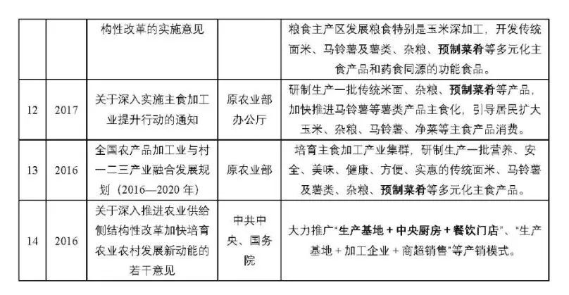 農業農村部在“十三五”期間就發布了多項支持預制菜肴的政策文件,重點是支持預制主食菜品的加工;而對中央廚房的支持雖然2016年就出現了,但在2020年后開始了更大力度的支持,且支持方向從最初的中央廚房+餐飲企業向中央廚房+物流配送等多元化發展。從支持的內容看,包括鼓勵產業化龍頭企業、農民合作社和家庭農場發展食品預處理、中央廚房等新業態,支持大中城市和主產區的郊區布局中央廚房,鼓勵預制菜肴的產品研發、加工技術研發等方面,以及支持社會資本投資等。