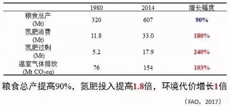 我國農業生產的資源環境代價非常高。張福鎖舉例談到:“從1980年到2014年我國糧食總產量增長了90%,但是化肥消費量增長了180%,過剩氮肥的排放量同樣增加了240%,我們付出了更高的資源環境代價獲得糧食安全。”