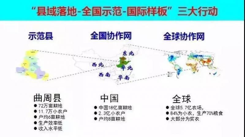 張福鎖根據以上案例認為,“三步走”戰略是有可行性的,接下來的問題就是如何使“三步走”戰略真正落地,為此,張福鎖院士特地選擇了河北省邯鄲市曲周縣作為示范縣,實施“三步走”戰略,并將該縣的成功案例推廣至全國,并逐漸推廣成為一個國際化的參考案例,為全世界提供經驗與范例,“縣域落地-全國示范-國際樣板”,這就是張福鎖院士所推廣的三大行動。