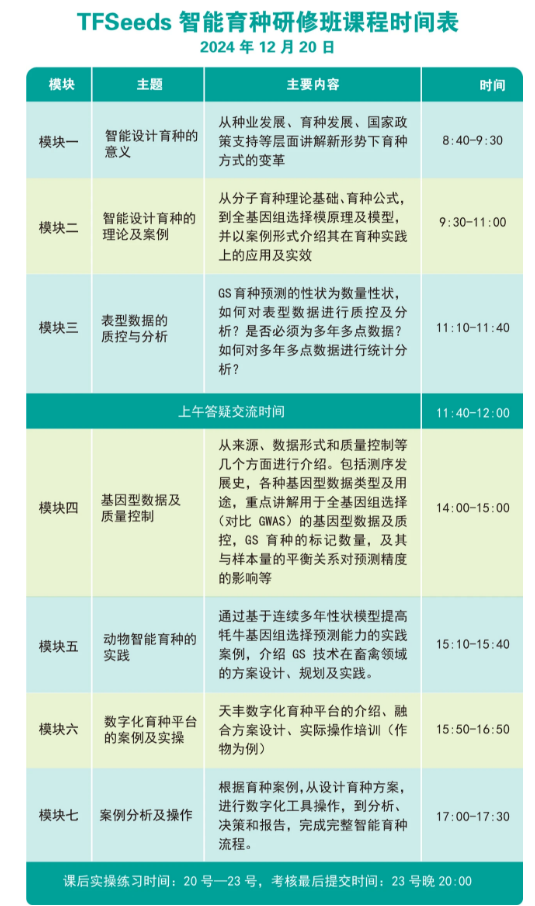 隨著農業科技的飛速發展,我們即將迎來一個全新的育種時代——育種4.0。在此,我們榮幸地宣布,備受期待的“動植物智慧育種全面講解:TFSeeds智能育種研修”高級研修班即將于2024年12月20日(周五)隆重開班!