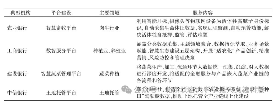 近年來,金融機構特別是大型商業銀行依托資金優勢、科技優勢,借助區塊鏈、大數據、人工智能等新一代信息技術,結合糧食、肉牛、茶葉以及農業生產托管等農業細分領域,搭建各類智慧農業管理平臺,提供更加精準、高效的金融和非金融綜合服務,實現農業產業與金融的深度融合和相互促進(見表3)。