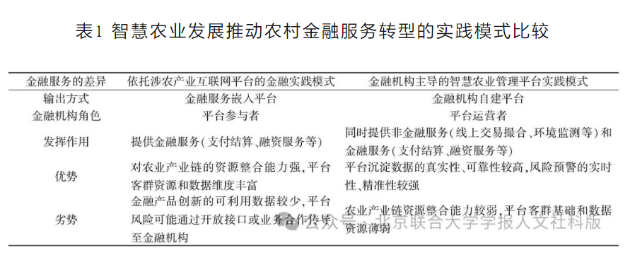 表1 智慧農業發展推動農村金融服務轉型的實踐模式比較