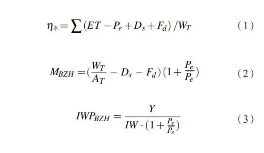 建立科學(xué)合理的節(jié)水評(píng)價(jià)指標(biāo)體系,目前采用的灌溉水利用系數(shù)、節(jié)灌面積比和畝均灌溉用水量等指標(biāo)不利于區(qū)域間節(jié)水水平的比較,同一作物灌溉地產(chǎn)量減去雨養(yǎng)地產(chǎn)量再除以單位面積灌溉定額計(jì)算灌溉水生產(chǎn)力的傳統(tǒng)方法,其應(yīng)用也因不易獲得不同區(qū)域雨養(yǎng)地產(chǎn)量而受到限制,而且缺少對(duì)某一區(qū)域節(jié)水后是否達(dá)到適水發(fā)展和可持續(xù)性的考核指標(biāo),應(yīng)該把區(qū)域地下水水位變化作為與灌溉水利用系數(shù)同等重要的評(píng)價(jià)指標(biāo)。因此,建議采用考慮鹽堿地沖洗壓鹽水量和稻田適宜滲漏量后的灌溉水利用系數(shù)η水、標(biāo)準(zhǔn)化的單位面積灌溉定額MBZH、標(biāo)準(zhǔn)化的灌溉水生產(chǎn)力IWPBZH和作物水分利用效率WUE以及地下水水位變化ΔH,作為不同區(qū)域農(nóng)業(yè)節(jié)水成效的綜合評(píng)價(jià)指標(biāo),具體為: