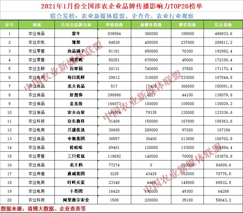 近日,由農業新媒體聯盟、企查查、農業行業觀察聯合發布的2021年1月份全國涉農企業品牌傳播影響力TOP20榜單..