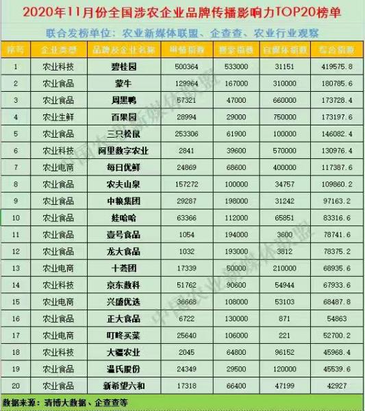 近日,2020年11月全國涉農企業品牌傳播影響力TOP20榜單新鮮出爐,碧桂園、蒙牛、周黑鴨摘得前三名;其中,..