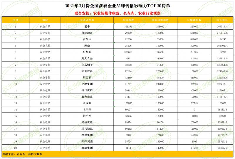 近日,由農業新媒體聯盟、企查查、農業行業觀察聯合發布的2021年2月份“全國涉農企業品牌傳播影響力TOP20”..